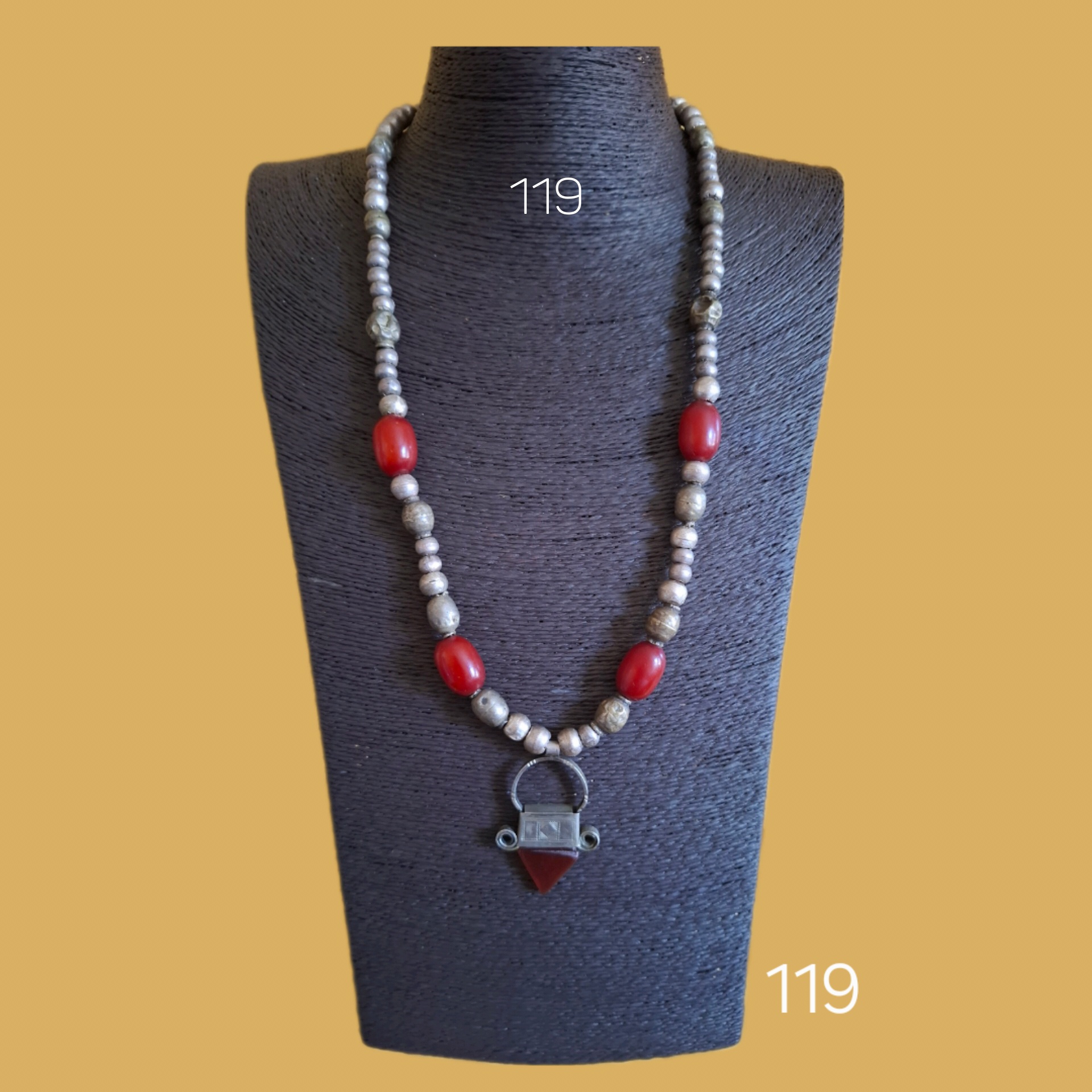 A very special find – a Tuareg ring of carnelian and silver metal, hung on necklace of Ethiopian silver beads plus red amber, to make a truly unique necklace.