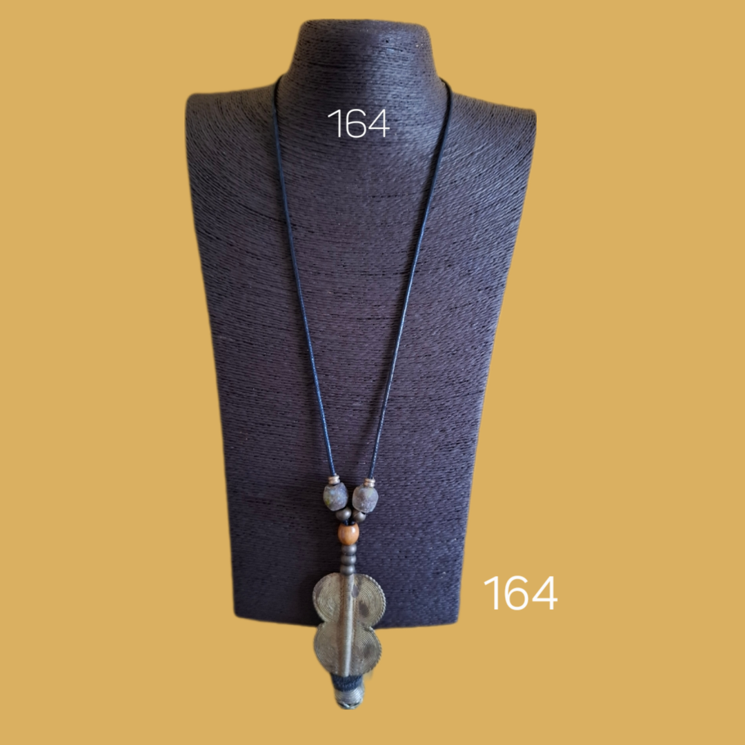 Ghanaian brass pendant with recycled glass and yellow amber on black leather thong. Long length